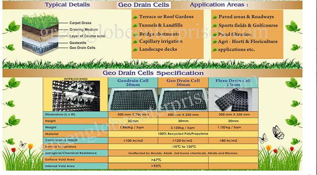 Geo Drain cell provides a drainage cavity and, when used in a landscaped roof, it provides additional protection layer for the waterproofing membrane and eliminates the need for a gravel course.